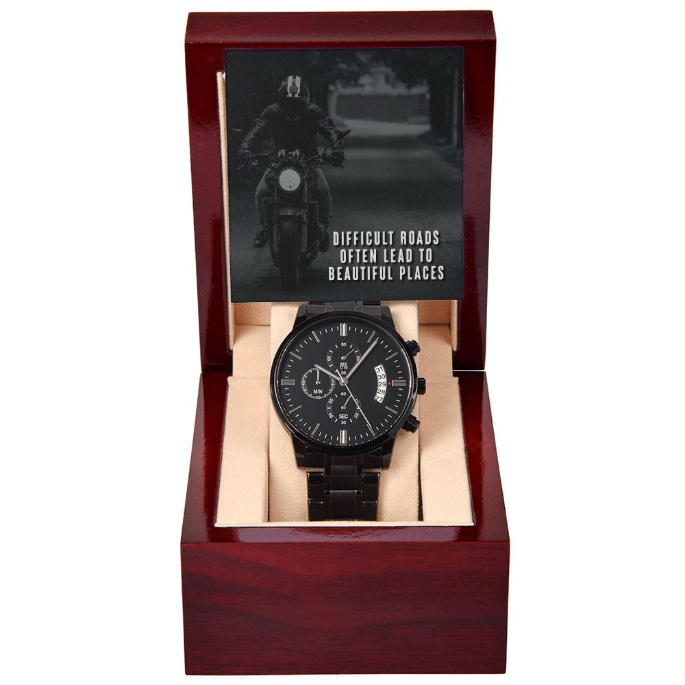 Los caminos difíciles a menudo conducen a lugares hermosos: reloj cronógrafo negro con caja de caoba